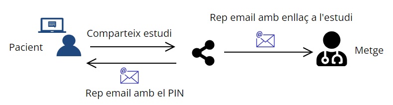 Quan es comparteix un estudi mèdic des del portal, s'envia un correu als destinataris que s'han indicat (metges o centres mèdics) amb un enllaç directe a la prova en qüestió. Per doble seguretat, el PIN per accedir a aquesta prova el rep el pacient en un correu a part, per tant s'haurà de facilitar manualment als metges o centres mèdics que s'hagi compartit.
